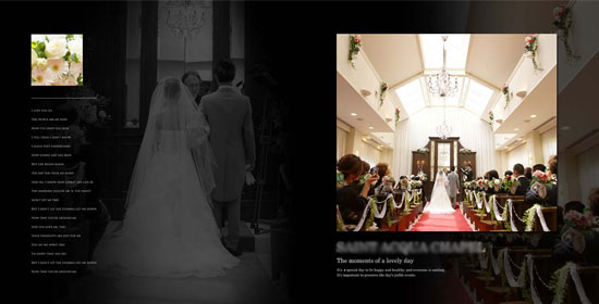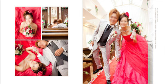 アルバムは日本製で、式場やホテルなどでも使われている本格派です。 表紙に写真をあしらい、中のページはラミネートで加工。しっかりとした厚みがあります。